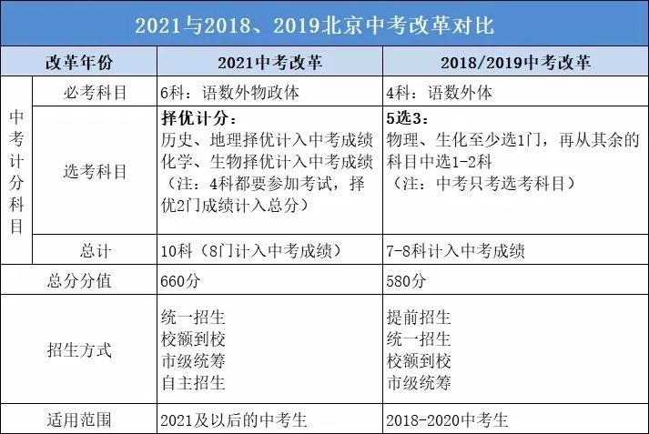 2021北京中考實行全科考試,歷史、地理擇優1門計入中考成績,生物、化學擇優1門計入中考成績;其中地理生物在初二下學期結課,化學、歷史中考結課。而2018-2020北京中考,必考科目為語文、數學、外語和體育;實行5選3選考。